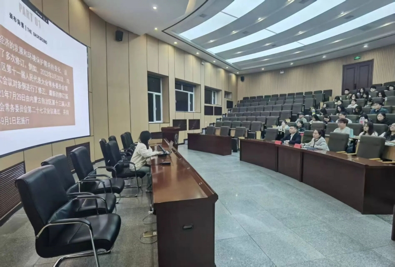 在讲座中,刘薇薇同学详细讲解了《内蒙古自治区地质环境保护条例》的出台过程、条例内容与效力位阶,并重点强调了条例中的地质环境保护原则,应当以预防为主、防治结合、综合治理。同时还应该建立地质环境监测网络,及时发布预警信息,对于地质灾害防治,应明确防治责任,实施防治工程,划定地质环境保护区域,实施分类管理。除此之外还对该条例规定的法律责任进行了详细解读。