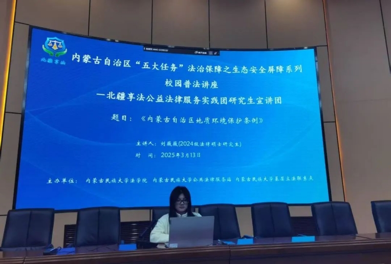 为进一步推动落实“八五”普法规划,助力法治通辽建设,内蒙古民族大学公共法律服务站组织开展内蒙古自治区“五大任务”法治保障之生态安全屏障普法系列讲座。3月13日晚,法学院北疆享法公益法律服务实践团研究生宣讲团在明理楼报告厅开展《内蒙古自治区地质环境保护条例》专题讲座。本次讲座由2024级法律硕士研究生刘薇薇同学主讲,共计100名学生到场聆听讲座。