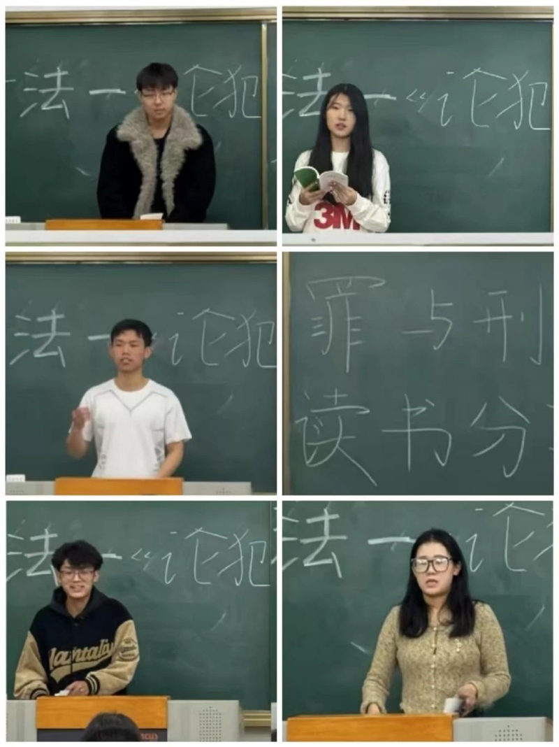 活动开始,同学们以小组为单位围绕“犯罪的定义与分类”、“刑罚的目的与限度”、“司法独立与程序正义”等主题展开了热烈讨论。在分享环节,第一组同学轮流上台发言,分享阅读心得和思考成果。史振江同学通过举例分析了当前我国刑法中存在的不足,并提出完善建议。何锐同学从整本书框架出发,提出“刑罚的目的是什么”的问题,并从“罪刑法定”原则出发探讨了作者提出的前瞻性观点。邹宏运同学着重讲述古今证人制度的不同。齐云霄同学从作者的观点出发展开了对酷刑的批判。张亚轩同学结合“刑罚人道化”理念,探讨了死刑存废问题,引发了同学们的深入思考。