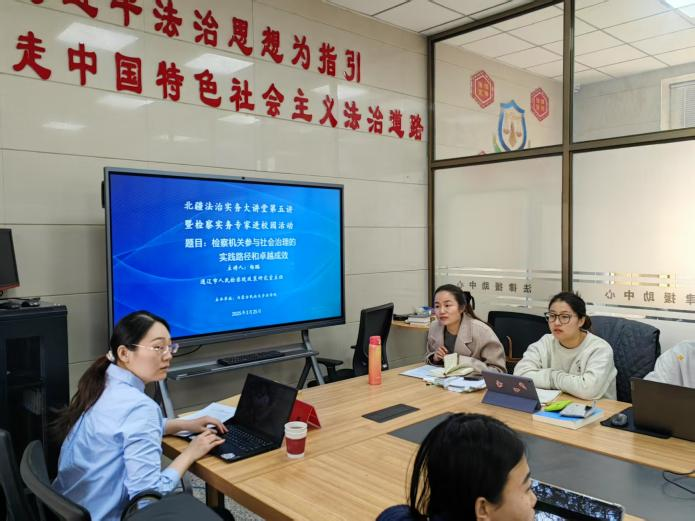 3月25日下午,法学院在内蒙古民族大学公共法律服务站开展北疆法治实务大讲堂第五讲暨检察实务专家进校园活动,通辽市人民检察院政策研究室主任、法学院法律硕士校外实务导师杨璐为法学院法律硕士研究生做了《检察机关参与社会治理的实践路径和卓越成效》专题讲座。本次讲座采用了检察官与法学教师联合授课模式,我院教师李文杰与杨璐检察官同堂授课。