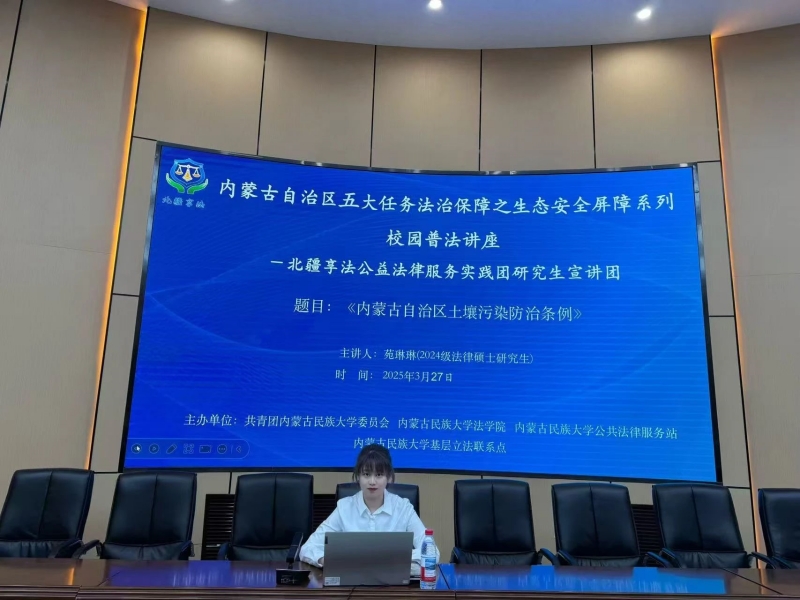为进一步推动落实“八五”普法规划,助力法治通辽建设,内蒙古民族大学公共法律服务站组织开展内蒙古自治区“五大任务”法治保障之生态安全屏障普法系列讲座。3月27日晚,法学院北疆享法公益法律服务实践团研究生宣讲团在明理楼报告厅开展《内蒙古自治区土壤污染防治条例》专题讲座。本次讲座由2024级法律硕士研究生苑琳琳同学主讲,共计200名学生到场聆听讲座。