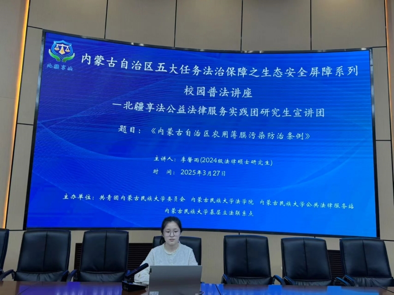 为进一步推动落实“八五”普法规划,助力法治通辽建设,内蒙古民族大学公共法律服务站组织开展内蒙古自治区“五大任务”法治保障之生态安全屏障普法系列讲座。3月27日晚,法学院北疆享法公益法律服务实践团研究生宣讲团在明理楼报告厅开展《内蒙古自治区农用薄膜污染防治条例》专题讲座。本次讲座由2024级法律硕士研究生李馨雨同学主讲,共计200名学生到场聆听讲座。