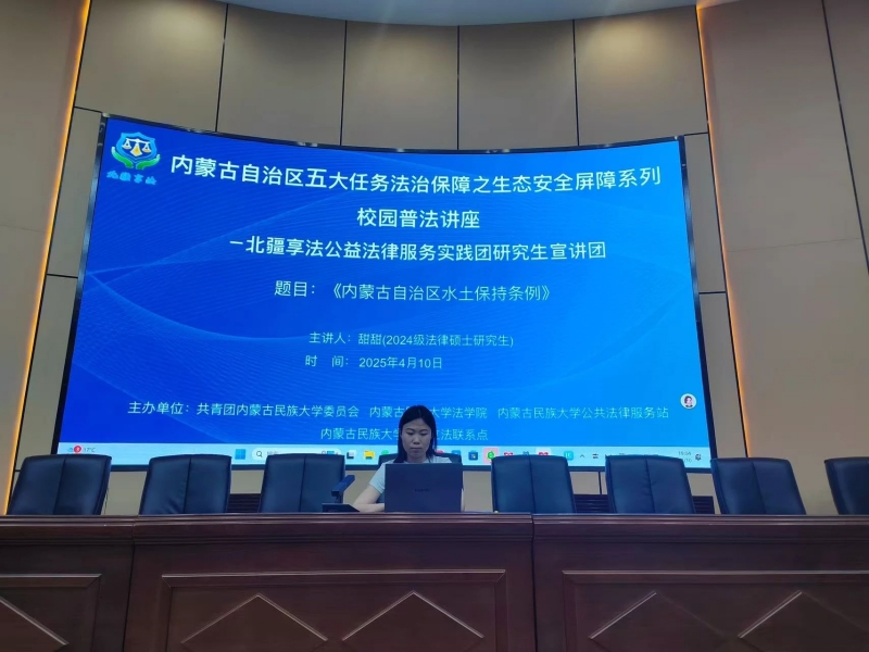 4月10日晚,北疆享法公益法律服务实践团研究生宣讲团在明理楼报告厅开展《内蒙古自治区水土保持条例》专题讲座。本次讲座由2024级法律硕士研究生甜甜同学主讲,共计200名学生到场聆听讲座。