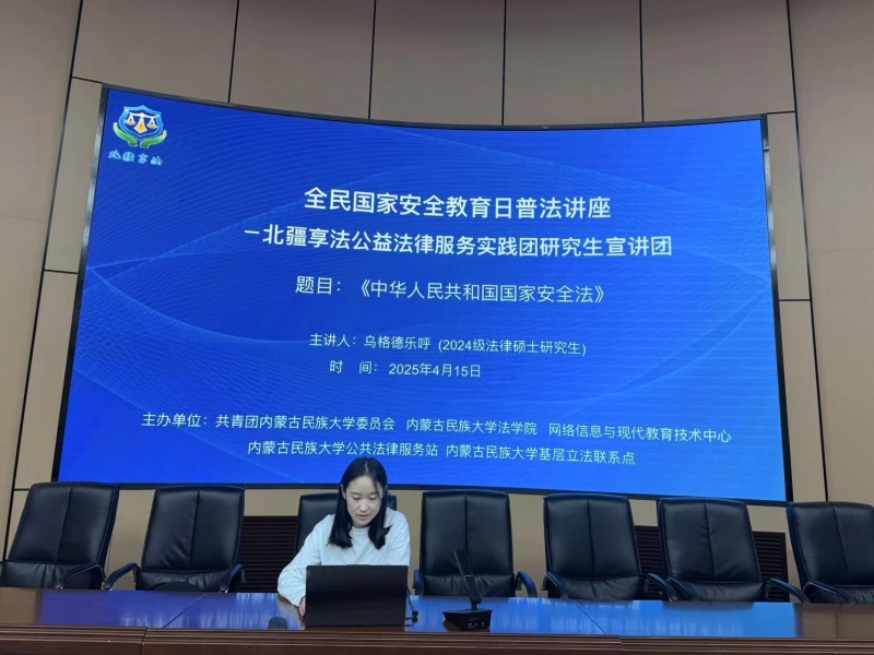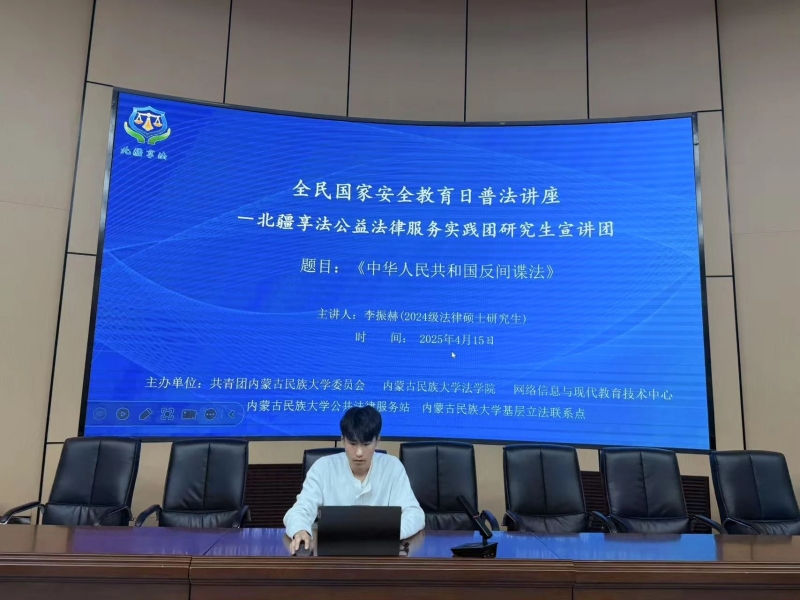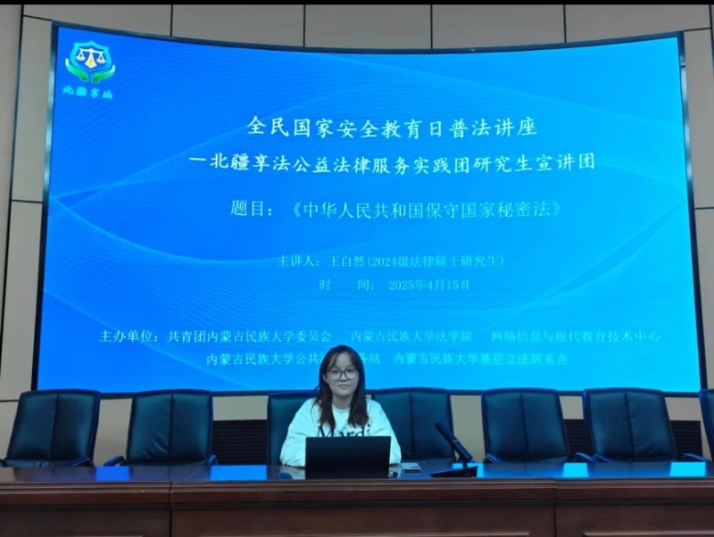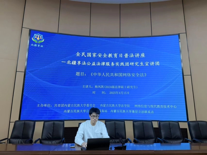 4月15日晚,北疆享法公益法律服务实践团研究生宣讲团在明理楼报告厅开展了四场全民国家安全教育日主题系列讲座。讲座分别由2024级法律硕士研究生杨凤凯、王自然、李振赫、乌格德乐呼四位同学主讲,共计200余名同学到场参与学习。