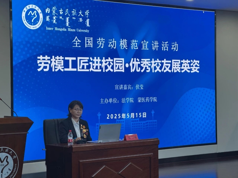 5月15日,法学院联合蒙医药学院在图书馆小报告厅开展劳动教育宣传月系列活动之“劳模工匠进校园,优秀校友展英姿”主题宣讲活动,我校优秀校友、全国劳动模范伏莹担任主讲嘉宾,法学院党委书记清河、学生工作办公室副主任王振宇出席,全校180余名同学到场聆听。