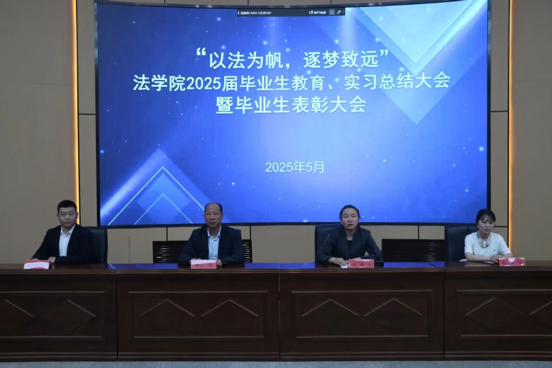为做好2025届毕业生思想教育、安全教育、廉洁教育、文明离校等各项工作,2025年5月21日法学院在霍林河校区明理楼报告厅召开“以法为帆,逐梦致远”2025届毕业生毕业教育、实习总结暨毕业生表彰大会。学院党委书记清河、学生工作办公室副主任王振宇、教学科研办主任白雅晰出席会议,2025届全体毕业生参加。会议由党委副书记徐晓影主持。