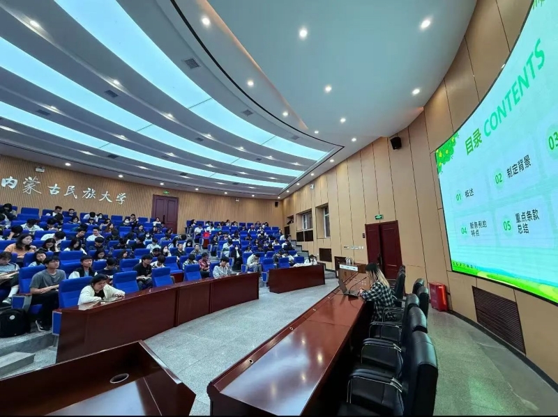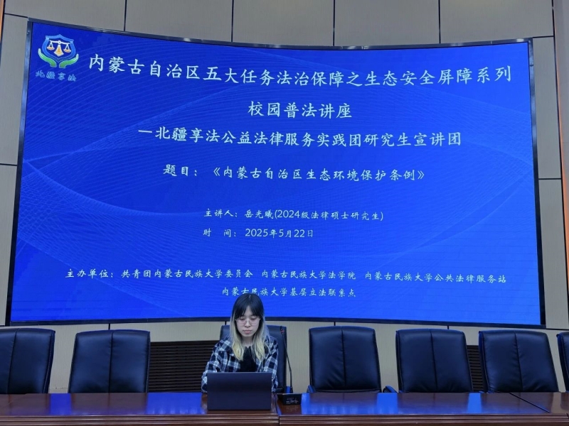 为进一步推动落实“八五”普法规划,助力法治通辽建设,内蒙古民族大学公共法律服务站组织开展内蒙古自治区“五大任务”法治保障之生态安全屏障普法系列讲座。2025年5月22日,法学院北疆享法公益法律服务实践团研究生宣讲团将在明理楼报告厅开展《内蒙古自治区生态环境保护条例》专题讲座。本次讲座由2024级法律硕士研究生岳光曦同学主讲,共计180多名学生到场聆听讲座。