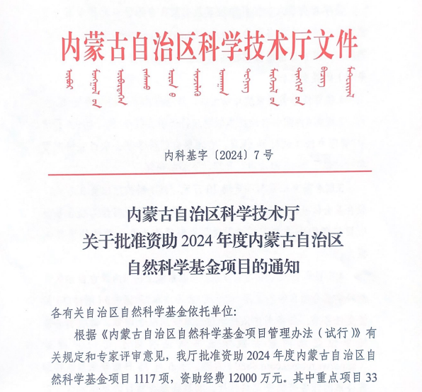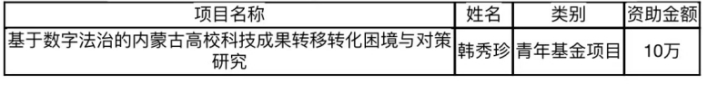 近日,内蒙古自治区科学技术厅公布了2024年度内蒙古自治区自然科学基金项目资助名单,我院韩秀珍老师申报的《基于数字法治的内蒙古高校科技成果转移转化困境与对策研究》成功获批青年基金项目立项,资助金额10万元,实现了我院自然科学基金项目零的突破。