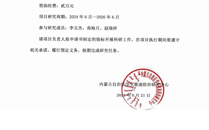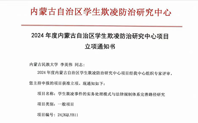 近日,内蒙古自治区高校人文社科重点研究基地“内蒙古自治区学生欺凌防治研究中心”2024年立项名单已公布。我院李英伟副教授申报的《学生欺凌事件的实务处理模式与法律规制体系完善路径研究》获批一般项目。