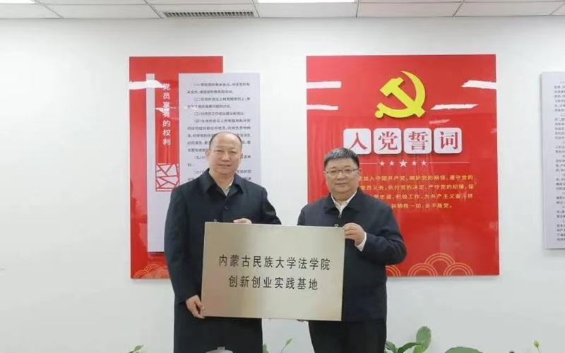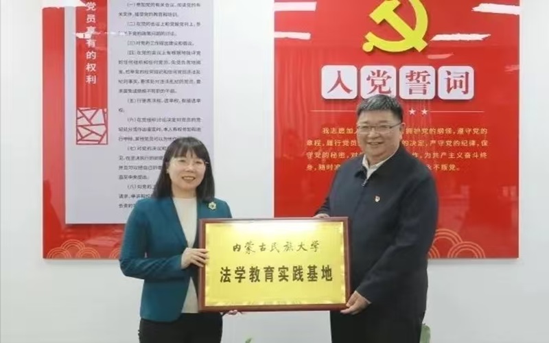 内蒙古民族大学法学院向科左中旗人民法院颁发“内蒙古民族大学法学教育实践基地”及“内蒙古民族大学创新创业实践基地”牌匾,共建实践基地。
