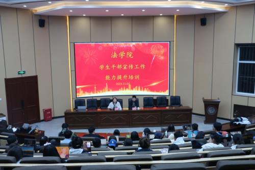 11月1日晚,法学院在霍林河校区明理楼报告厅举办学生干部宣传工作能力培训会。学校党委宣传部网络信息科科长吴胡日查到会指导。会议由法学院团总支副书记黄格尔主持。