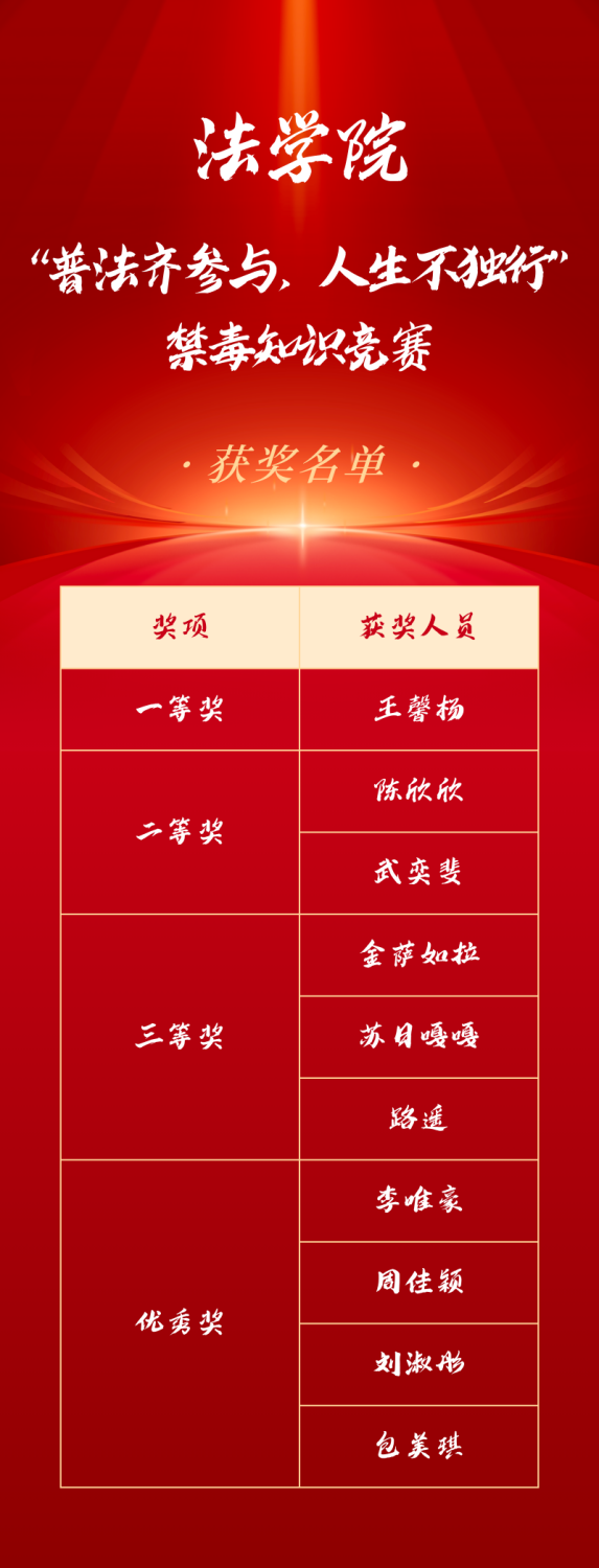 为认真学习贯彻习近平法治思想和文化思想,认真学习宣传贯彻习近平总书记关于宪法的重要讲话和指示批示精神,引导广大青年远离毒品,提高广大青年的禁毒意识,增强广大青年的自我保护意识和防范风险,激发广大青年对于学习禁毒知识的兴趣,法学院于12月2日开展“普法齐参与 人生不独行”禁毒知识竞赛。