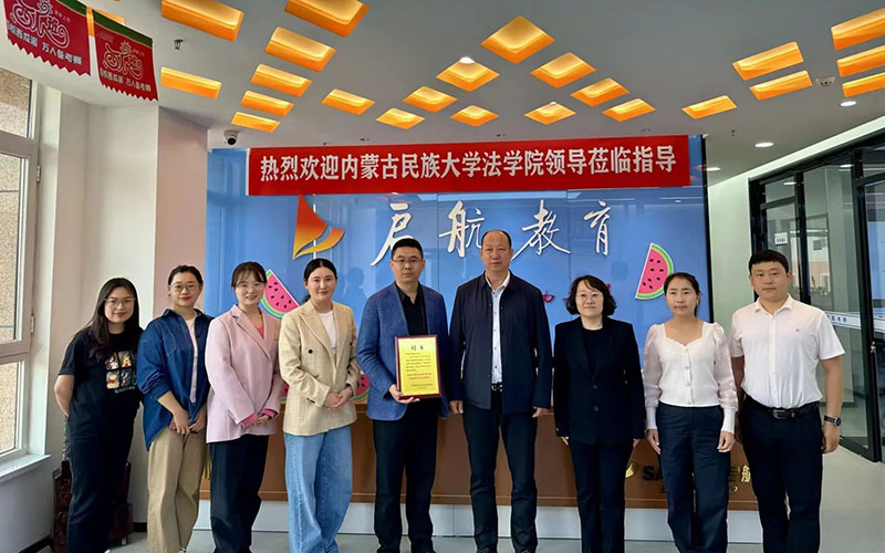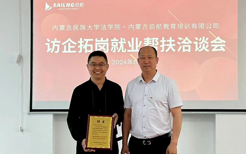 活动中,机构负责人陪同下清河一行参观了公司,详细介绍了启航考研的教学特色,包括其独特的课程体系、教学方法、办学规模、师资力量以及软硬件设施等。参观后与启航考研的负责人许超及团队主要成员进行深入的交流,详细询问了学员的考研和就业情况,包括就业率、就业方向以及学员的满意度等。在交流中,双方就如何更好地培养高素质法律人才、促进法学教育与就业市场的有效对接、本科生未来发展规划等内容进行深入探讨。为进一步加强合作,法学院特聘启航考研负责人许超为内蒙古民族大学法学院就业升学企业导师。清河为许超颁发聘书。他表示将全力支持法学院的人才培养和就业帮扶工作,为法学院学子提供考研指导和职业规划服务。