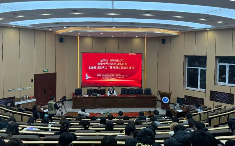 为推进校园法治建设,提升大学生法治意识与自我保护能力。11月5日晚,法学院与民族团结姊妹学院动物科技学院联合北京市道成(通辽)律师事务所在明理楼报告厅共同举办执业律师派驻仪式暨“律师朋友宣讲会”。动物科技学院学工办主任鲍海英,道成律所祁光明主任以及两院100余名同学参加。会议由法学院学工办副主任王振宇主持。
