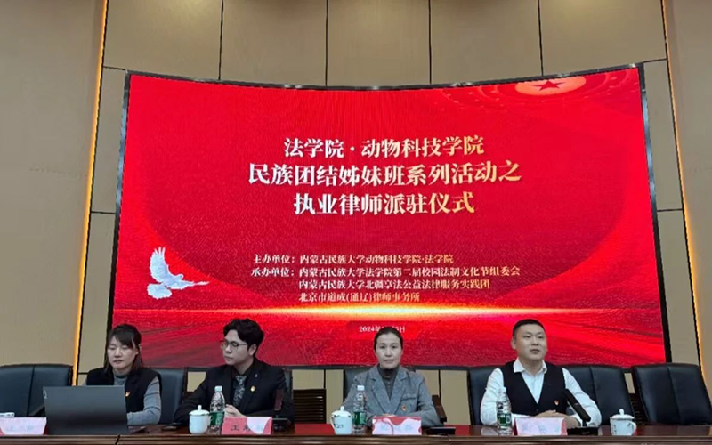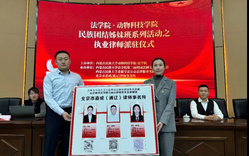 活动伊始,内蒙古民族大学北疆享法公益法律服务实践团执业律师宣讲团团长、执业律师白嘎力代表法学院向动物科技学院派驻3名 北京道成律师事务所的执业律师,动物科技学院的广大师生可以向派驻律师进行免费的法律咨询。