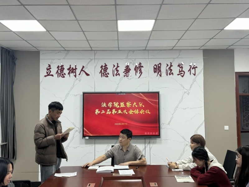 2月17日晚上,法学院在育人楼306召开第二届监察大队第五次会议。学工办副主任王振宇及监察大队35名成员参会,会议由大队长傲孟希乐主持。