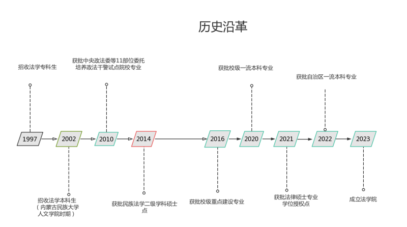 法学院于2023年5月成立,下设法学专业。法学专业为文理兼招专业,旨在培养能够服务于地方法治建设,在国家机关、法律服务机构、企事业单位和其他相关机构胜任法律工作的高素质应用型人才。法学专业于1997年开始招生,2014年获批民族法学硕士学位授权点,2021年获批法律硕士专业学位授权点,2022年获批内蒙古自治区一流本科专业。